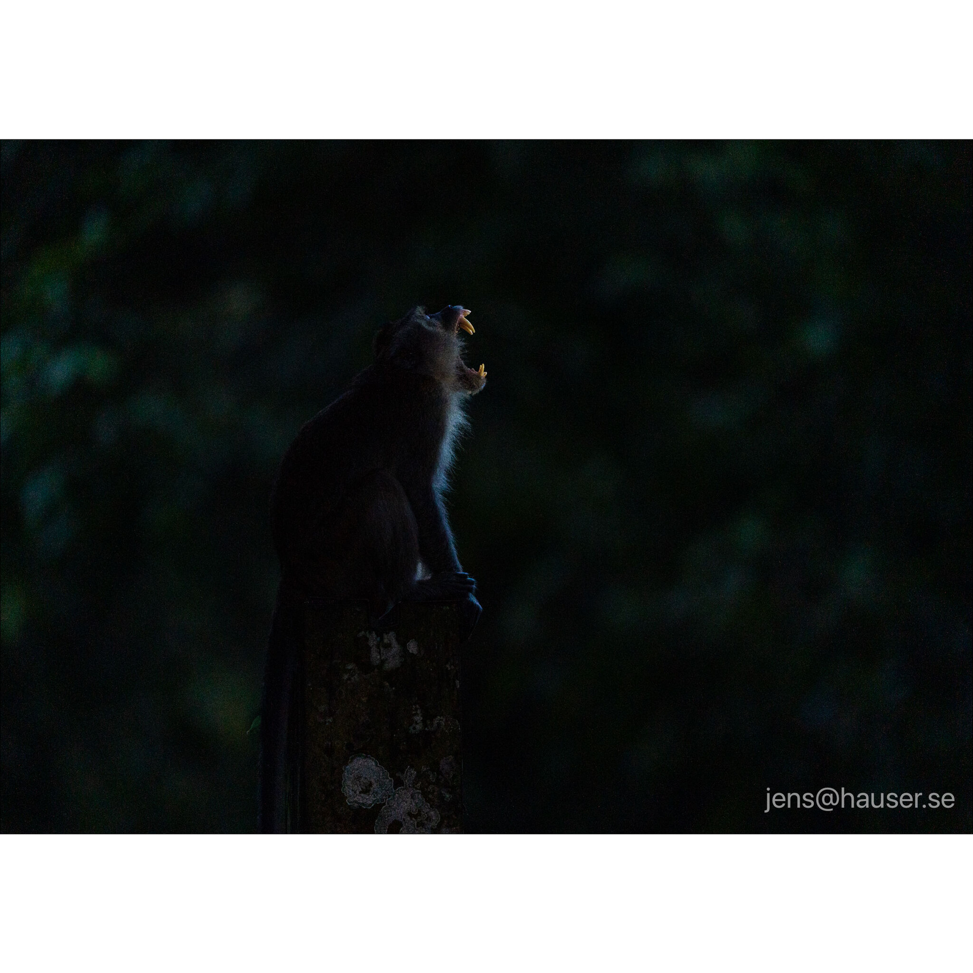 Long-tailed macaque’s dominance display glows in rim light at dusk Foto: Jens Hauser